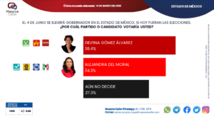 Ante la pregunta a los encuestados de: “EL 4 DE JUNIO SE ELEGIRÁ GOBERNADOR EN EL ESTADO DE MÉXICO. SI HOY FUERAN LAS ELECCIONES. ¿POR CUÁL PARTIDO O CANDIDATO VOTARÍA USTED?”, el 38.4% de los encuestados dijo ir con la maestra Delfina Gómez Álvarez, mientras que el 34.3% dijo ir con Alejandra del Moral.
