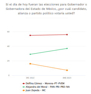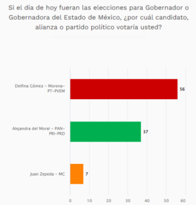 El 56% de los encuestados dijo inclinarse por Delfina Gómez, de los partidos Morena, PT, PVEM; el 37% eligió a Alejandra del Moral, de los partidos PAN, PRI y PRD; mientras que sólo el 7% dijo votaría por Juan Zepeda, de MC.